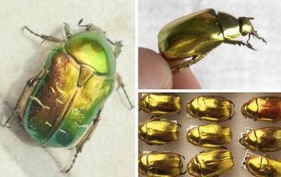 自然界存在著某些甲蟲看起來如同24克拉的黃金珍寶,實際上只是它們的外殼閃閃發光,其中黃金聖甲蟲和黃金龜甲蟲就屬於金色甲蟲。由於它們的奇特外形,致使多年前人們大肆捕捉,現已瀕臨滅絕。