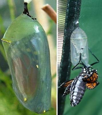 帝王蝴蝶成年體長有帶黑色紋理的橙色翅膀,在翅膀邊緣有白色斑點。然而當它們處於繭發育階段,卻是另一番模樣,繭體呈翡翠綠顏色,但在繭體周圍存在著金色線狀結構。